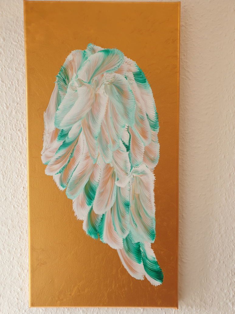 Auf goldenem Hintergrund entfaltet sich die Heilkraft des Flügels des Erzengels Raphael in grün und weiß.