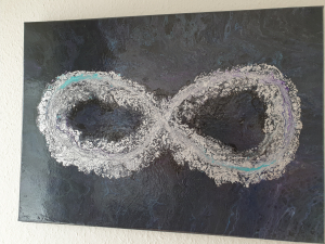 Der Punkt in der Mitte der liegenden Acht ist das „Jetzt“, der Kreis links von der Mitte ist die Vergangenheit, der rechte Kreis die Zukunft. Ein Fluss fließt unendlich durch unser Leben – alles ist miteinander verbunden.